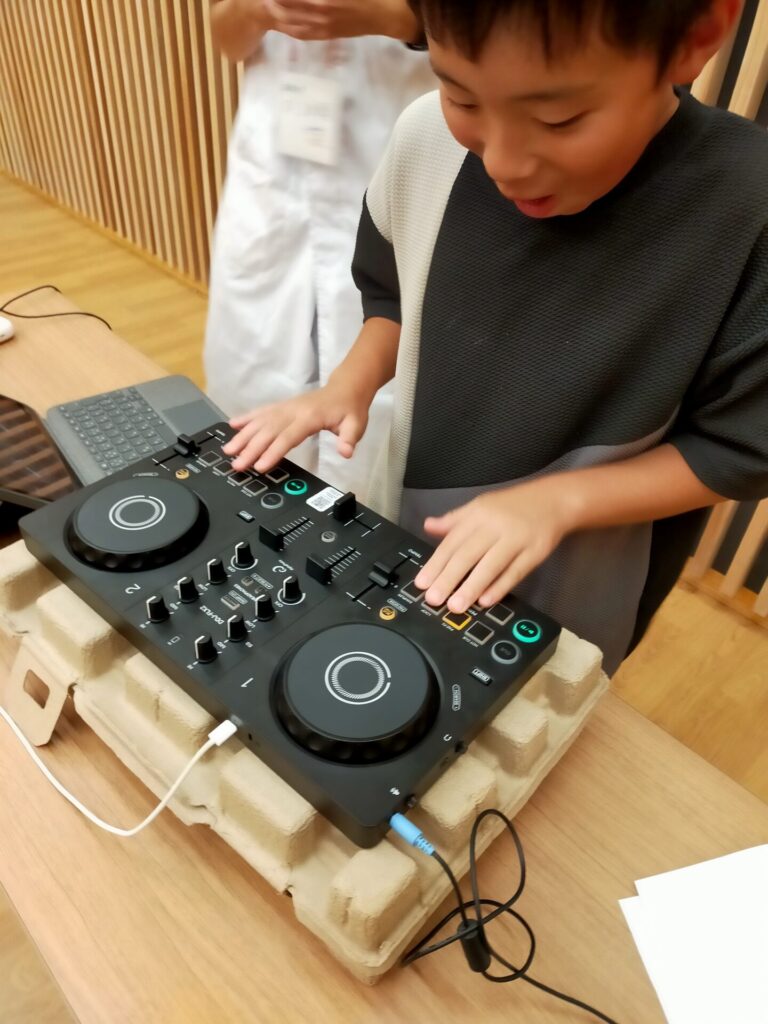 本格的なDJコントローラーを前に、子どもたちの目がキラキラと輝いていました。両手でフェーダーやノブを操作しながら、音楽をミックスしていく感覚。夢中になって機材に向き合う姿が印象的でした。